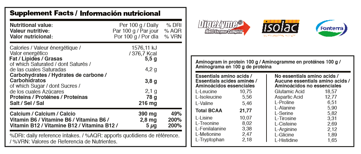 Por 100 g de proteína neta 20% de BCAA y un 43% de Aminoácidos esenciales (BCAA incluidos), que provienen de la propia proteína de forma natural, sin aminoácidos añadidos.