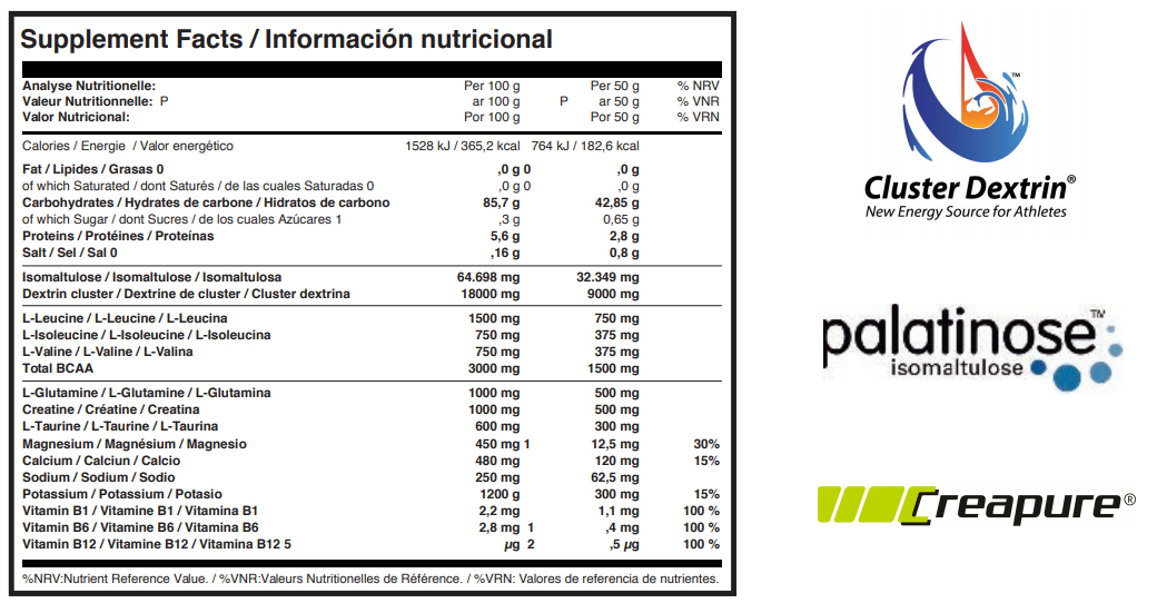ComprarCarbohidratos de última generación Ciclo Dextrina y Isomaltulosa de las patentes Cluster Dextrin® y Palatinose®, BCAA, L-Glutamina, Taurina, Creapure ®, vitaminas B1, B6 y B12, y Minerales parte de ellos procedentes del agua del mar.