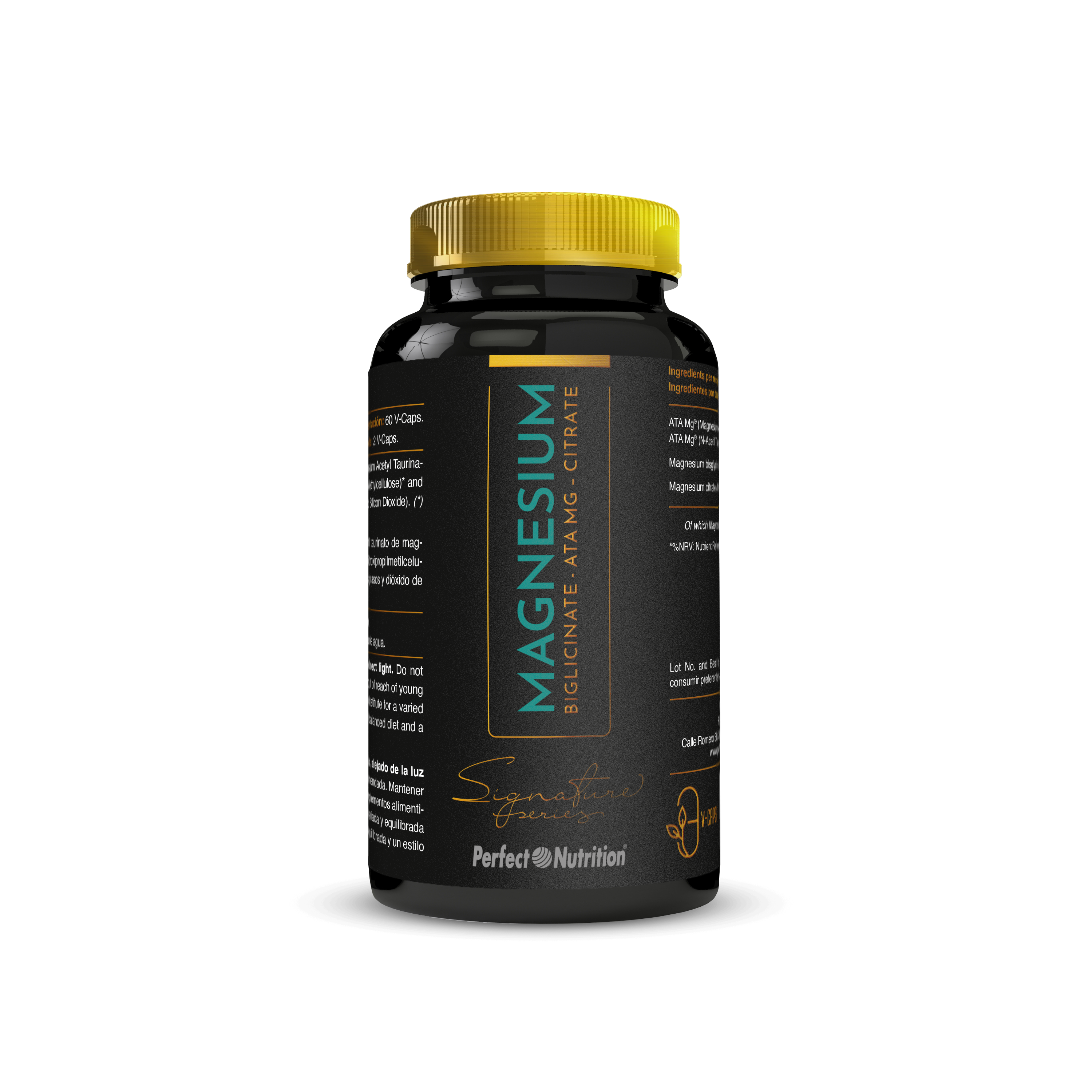 MAGNESIUM 60 V-Caps Signature Series es una fórmula exclusiva de Perfect Nutrition que combina tres de las mejores fuentes de este mineral: Bisglicinato, Acetil Taurinato (patente ATA Mg) y Citrato. Este producto está diseñado para ofrecer la máxima eficacia y biodisponibilidad, siendo una solución ideal para apoyar la salud general y mejorar la calidad de vida.