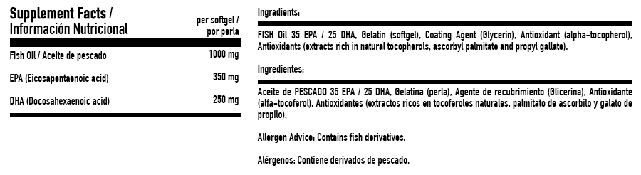 ComprarOmega 3 GEN 35 EPA / 25 DHA es un suplemento dietético compuesto por aceite de pescado rico en Omega 3 de alta pureza. El Omega 3 es un ácido graso esencial, es decir, un ácido graso que nuestro cuerpo no es capaz de fabricar, por lo que debe ser ingerido mediante las comidas o la suplementación. Cada cápsula de Omega 3 GEN 35 EPA / 25 DHA aporta 1 gramo de Omega 3 del cual el 35% es EPA (ácido eicosapentaenoico) y el 25% DHA (ácido docosahexaenoico).