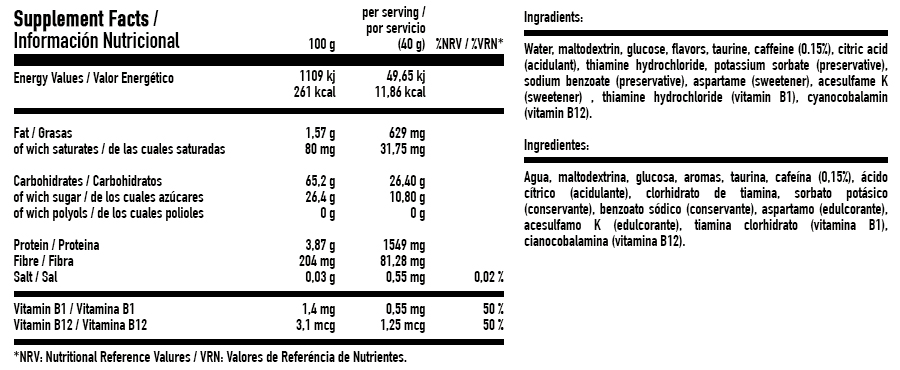 COMPOSICIÓN PRINCIPAL Carbohidratos: Compuesto por Maltodextrina y Glucosa en la proporción 2-1, está demostrado que los carbohidratos de transporte múltiple son mucho más eficientes a la hora de aportar energía, ambos tienen un índice glucemico alto, con lo que no es un gel recomendable para larga duración, ya que por su alto contenido en Cafeína no es recomendable tomar más de dos geles por prueba.